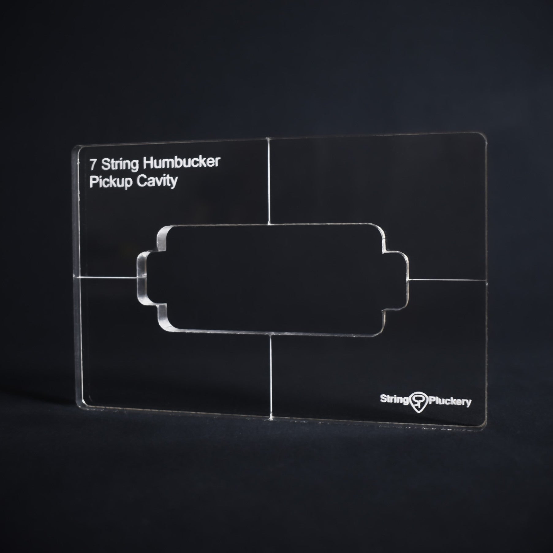 This template fits most 7 string tabbed humbucker pickups. Verify measurements before routing. Covered humbuckers may have larger housings than open core models.